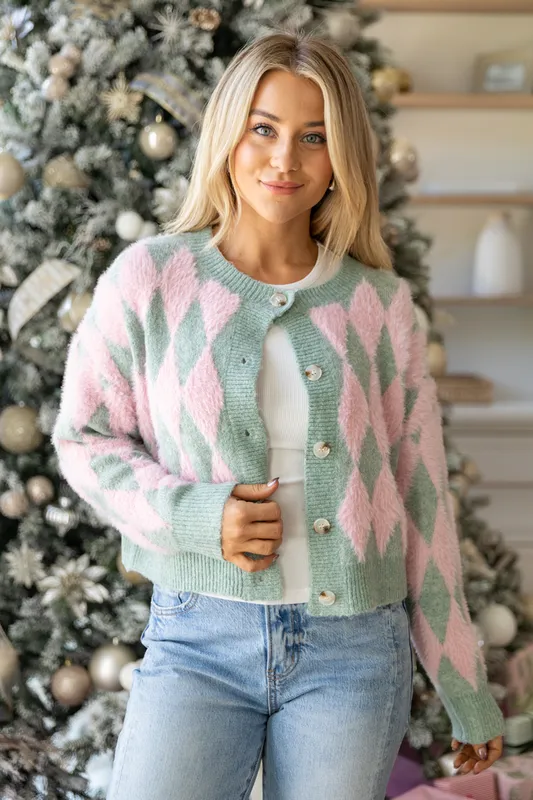 Long Sleeve Pink and Mint Argyle Cardigan