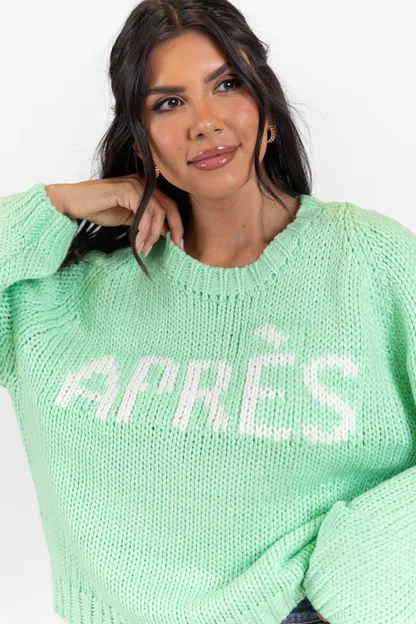 - Crew neckline, ribbed hem, "Apres" script