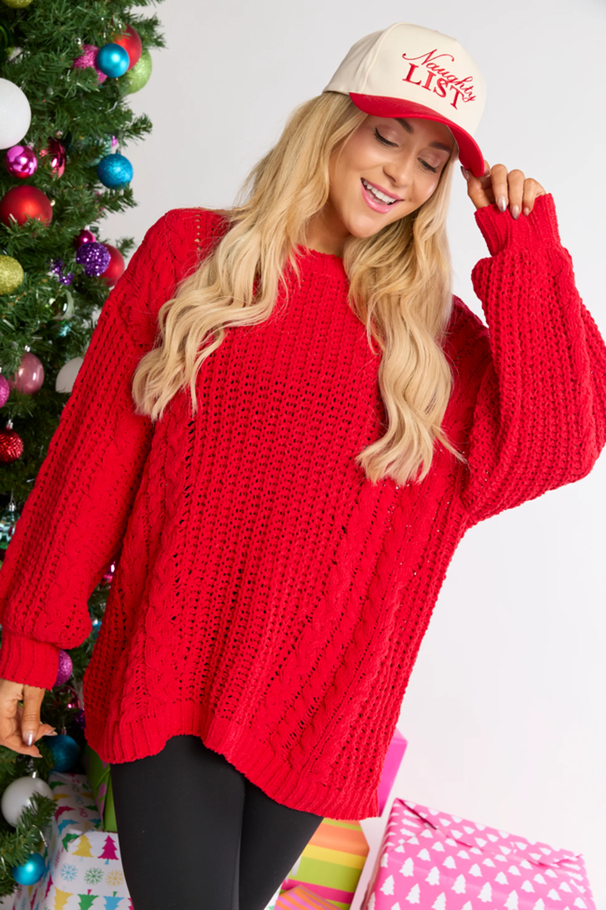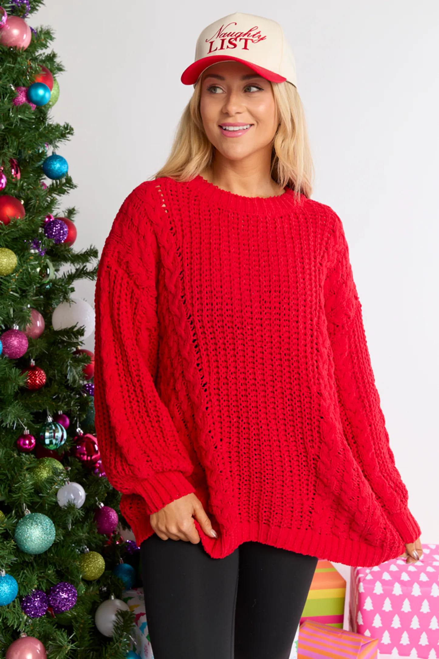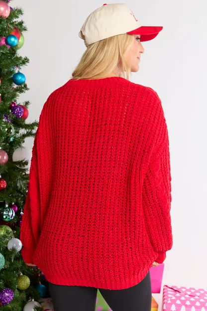 Red Chenille Cable Knit Oversized Sweater