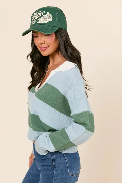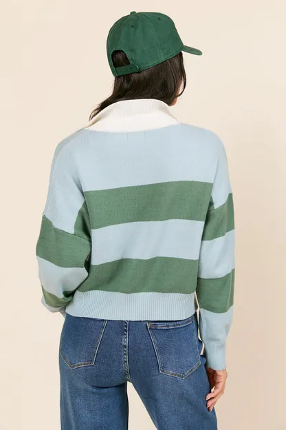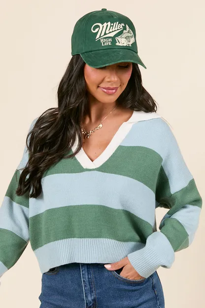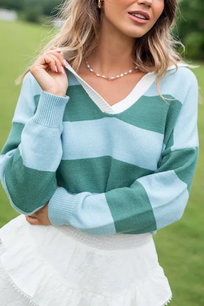 - Blue and Green Striped Collared V-Neck Sweater