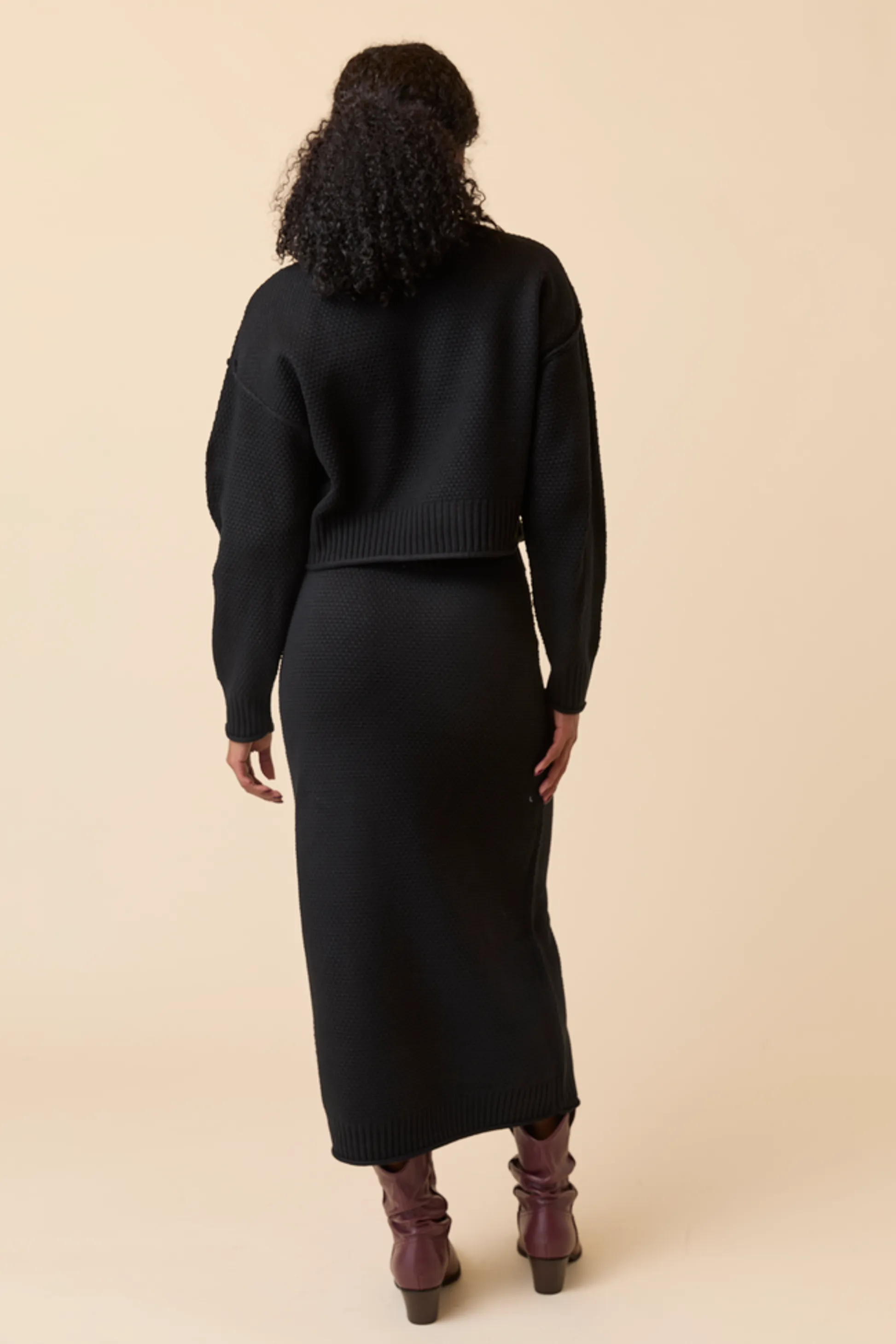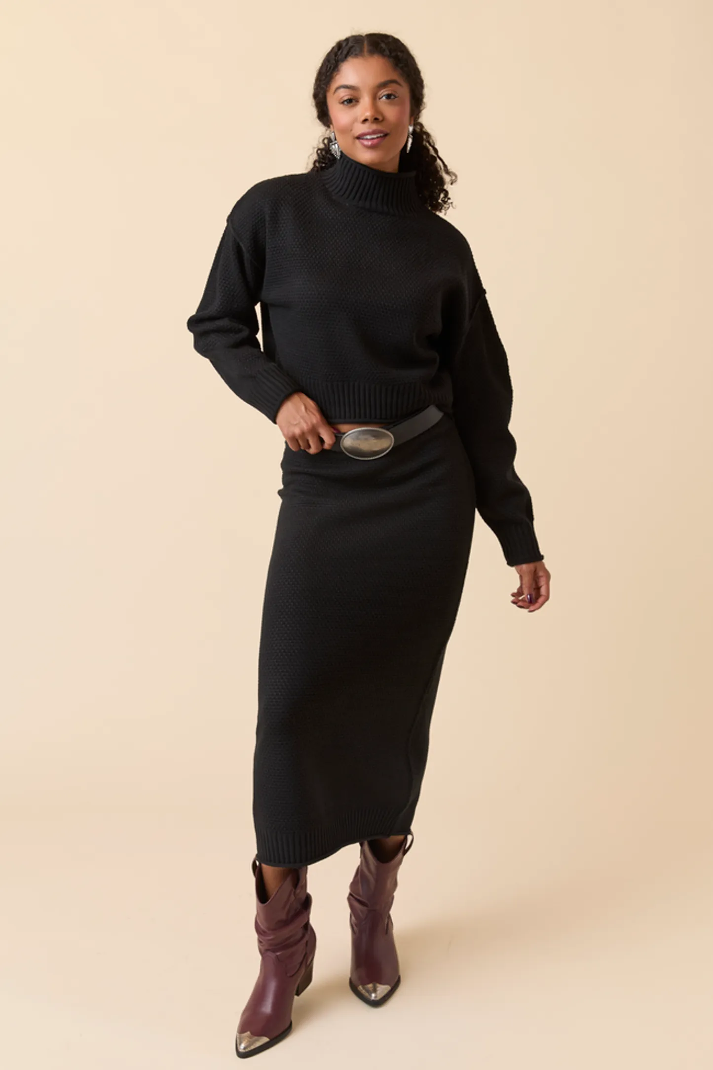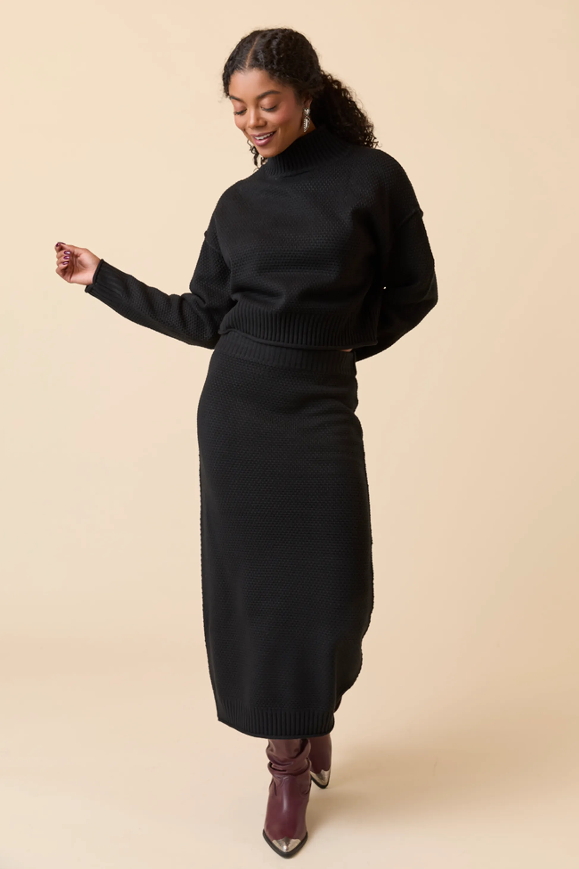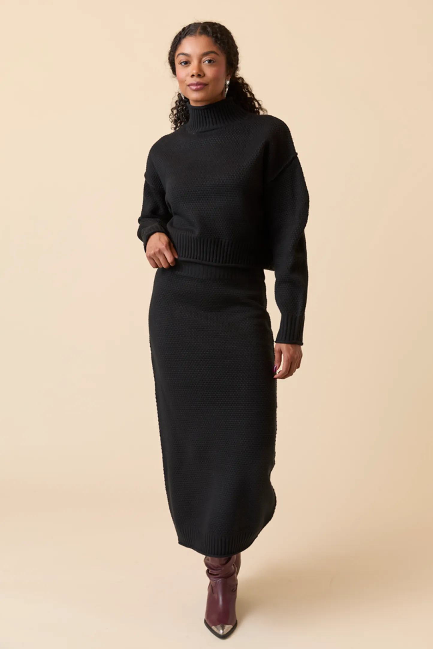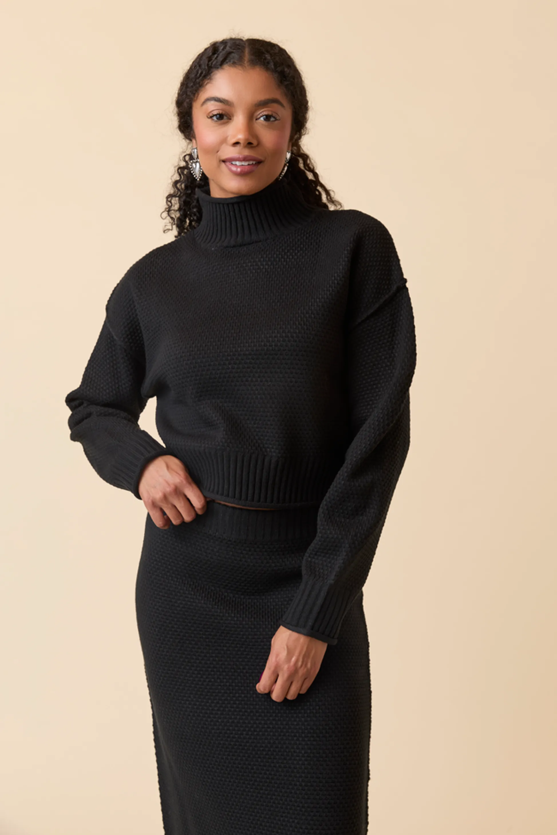 - Top: Long sleeves, turtle neckline, Ribbed hem